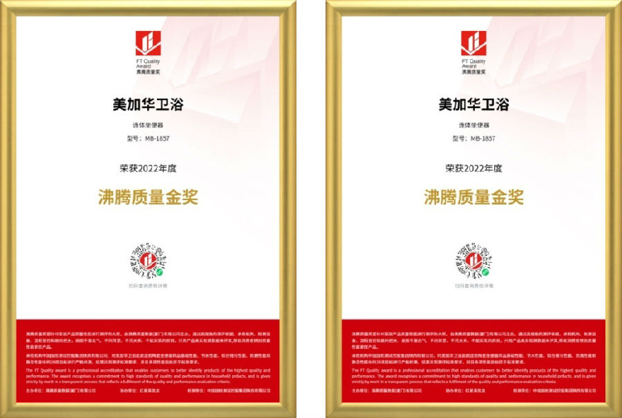 此番頒獎盛典,民族衛(wèi)浴品牌美加華旗下連體坐便器(型號:MB-1857)和智能坐便器(型號:MB-1875G)兩款產(chǎn)品,在130余家國際國內(nèi)主流家居品牌的400余款產(chǎn)品中,強(qiáng)勢摘下“沸騰質(zhì)量金獎”桂冠。